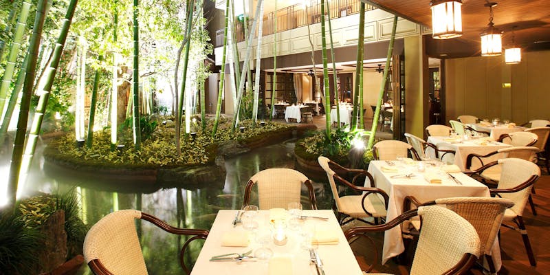 レストランの奥には、竹林のある中庭を臨むテラス席があります。