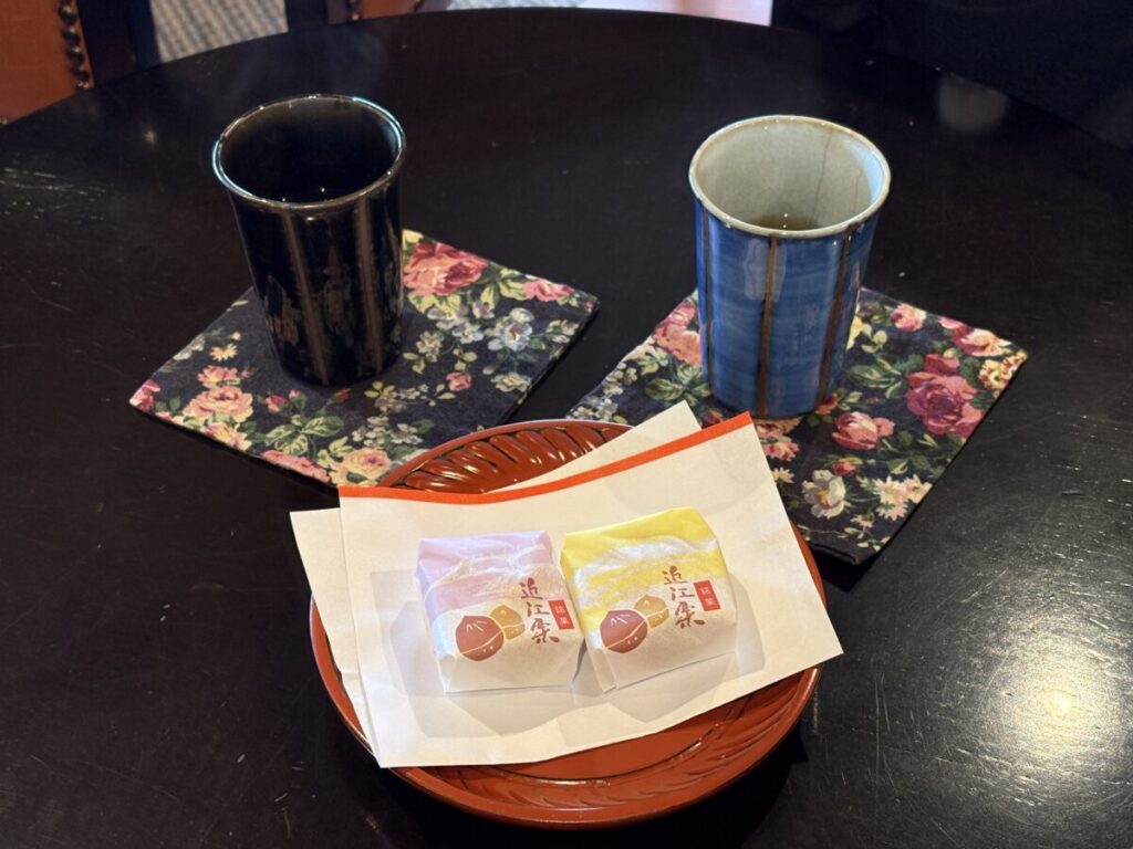 着席すると、スタッフの方が黒豆茶とお茶菓子(銘菓 近江栗)を運んできてくれました。
