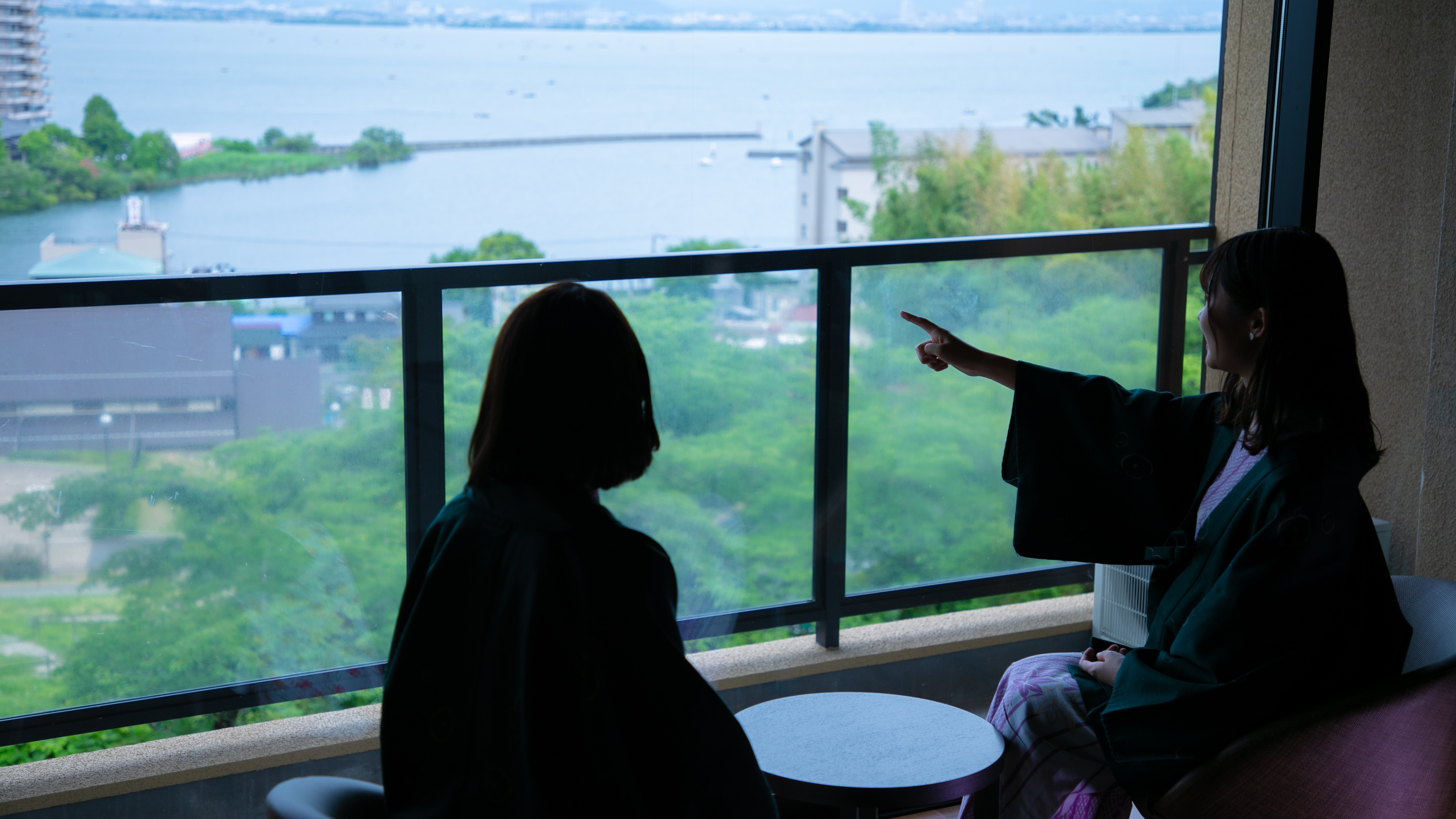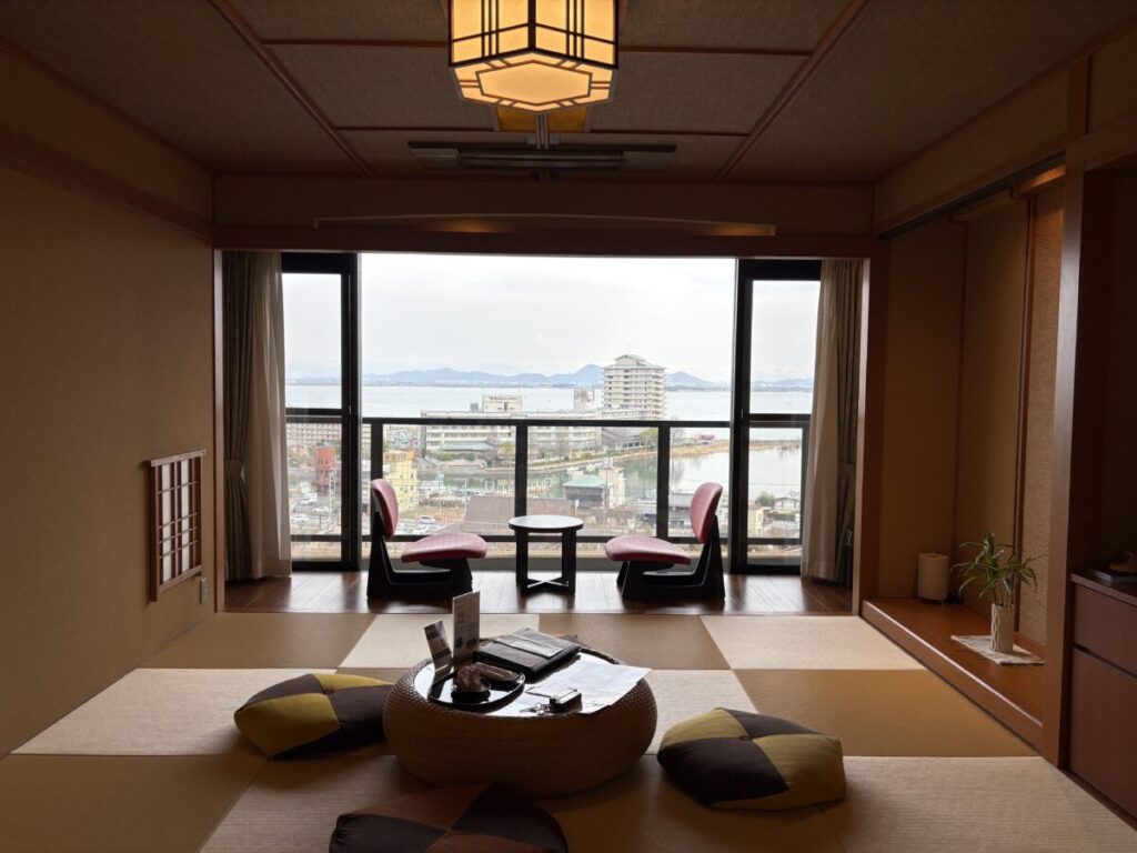 部屋の大きな窓からは、琵琶湖とその奥に美しいシルエットの山が広がっています。