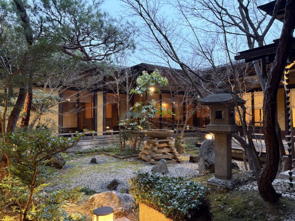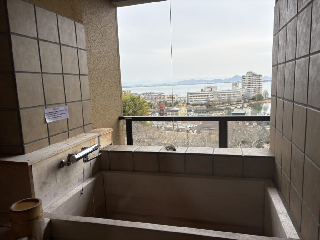 大浴場の露天風呂は琵琶湖が直接見えるわけではありませんが、雰囲気のある造りで温泉宿らしい情緒が感じられます。