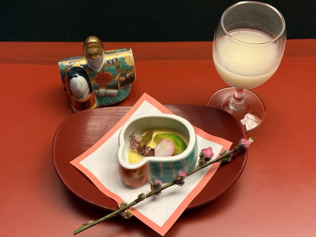 3月の訪問ということで、器も雛人形の衣装をモチーフにしたような華やかな陶器で、赤い漆塗りのトレーに桜の枝が添えられた美しい盛り付けでした。