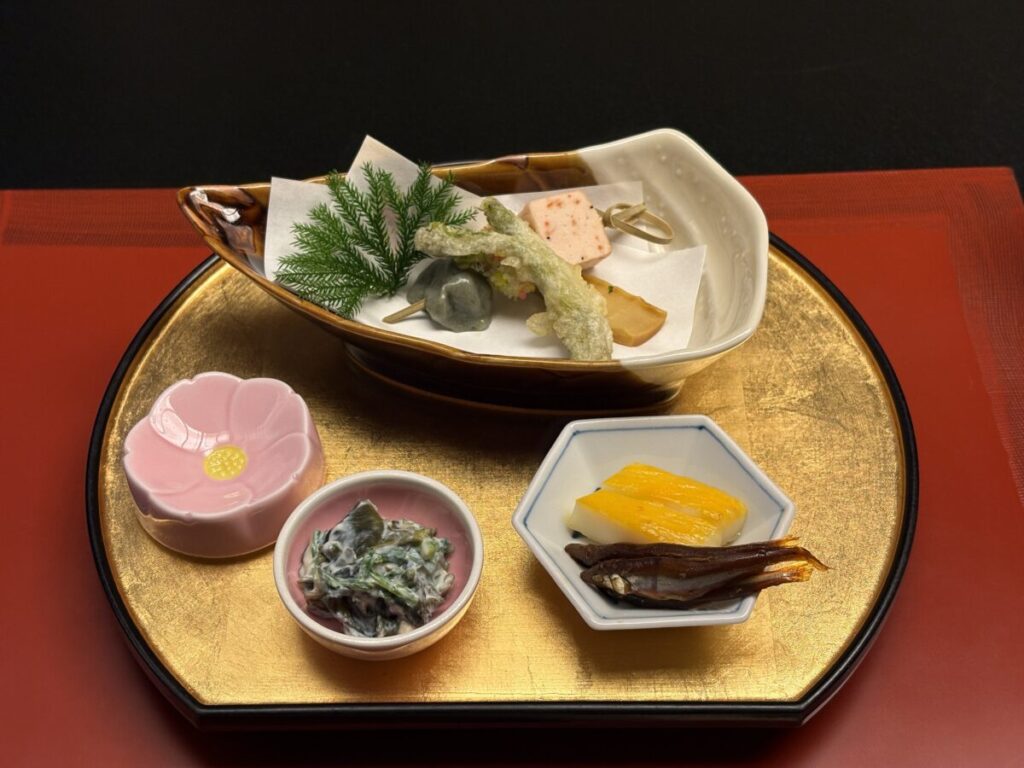 - 焼物:本諸子三色田楽(白味噌・赤味噌・蕗の薹)、桜花大根梅肉漬け