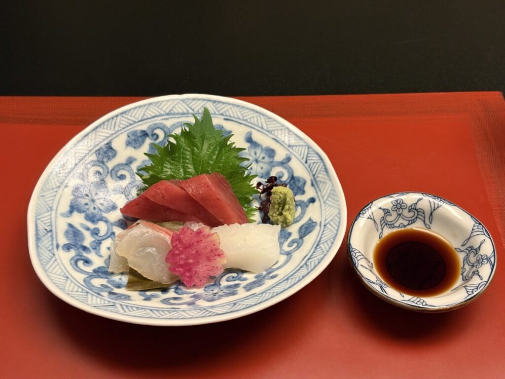 お造りは横輪(よこわ)、鯛昆布締め、紋甲烏賊の三種。
