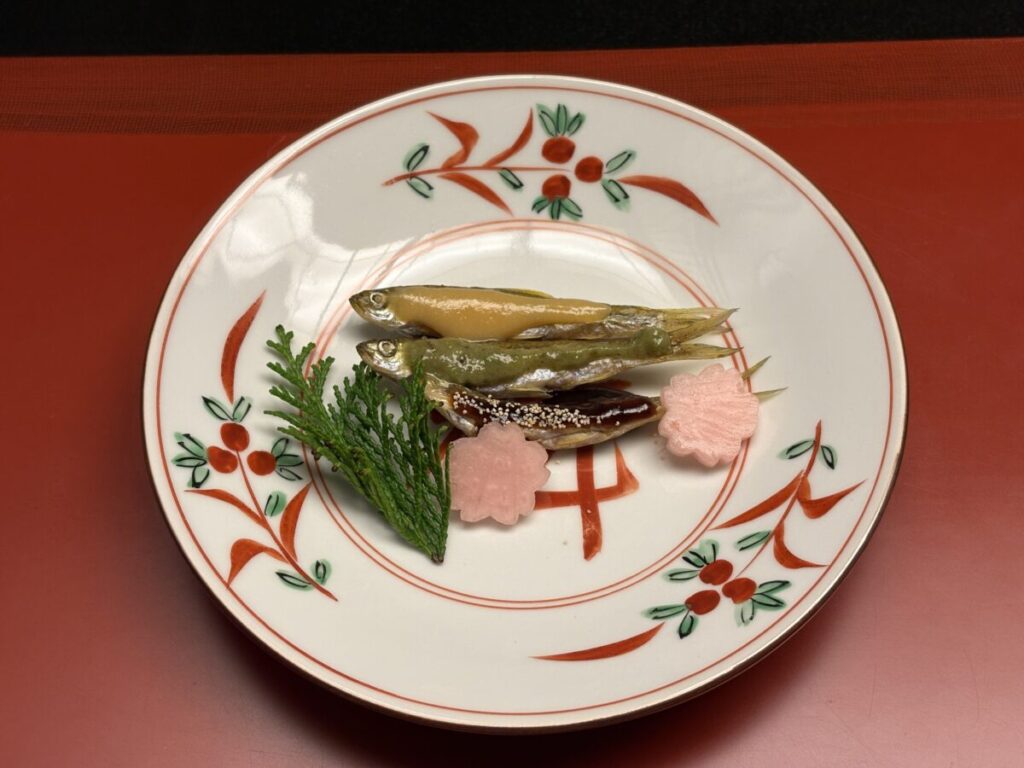 - 前菜:三色串、烏賊黄身酒盗焼き、小鮎山椒煮、竹の子木の芽焼き、永源寺たらの芽天婦羅、芹と若芽白和え