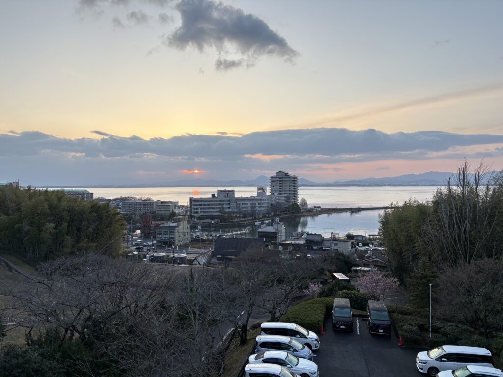 太陽がまだのぼりきっていない朝の空と琵琶湖の景色を眺めながら、どこからか聞こえてくるとんびの鳴き声。